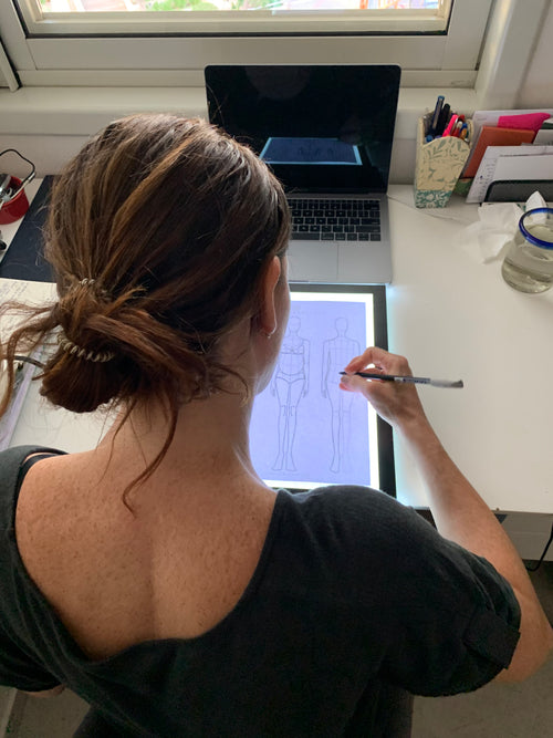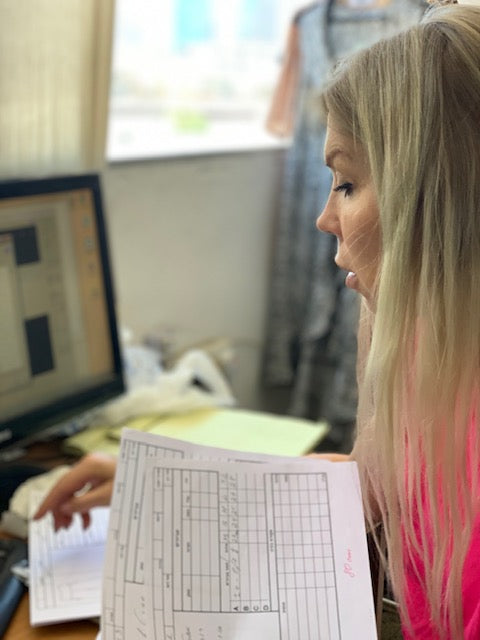 Working on pattern measurements with our highly skilled pattern maker, Anna.